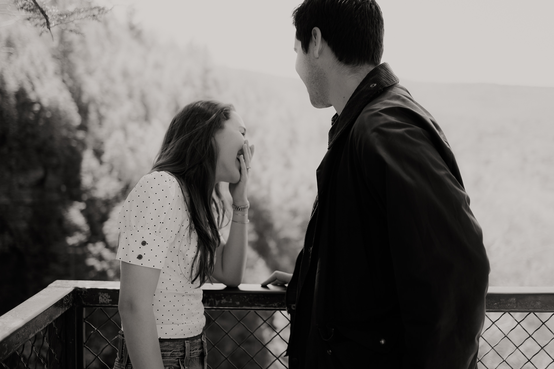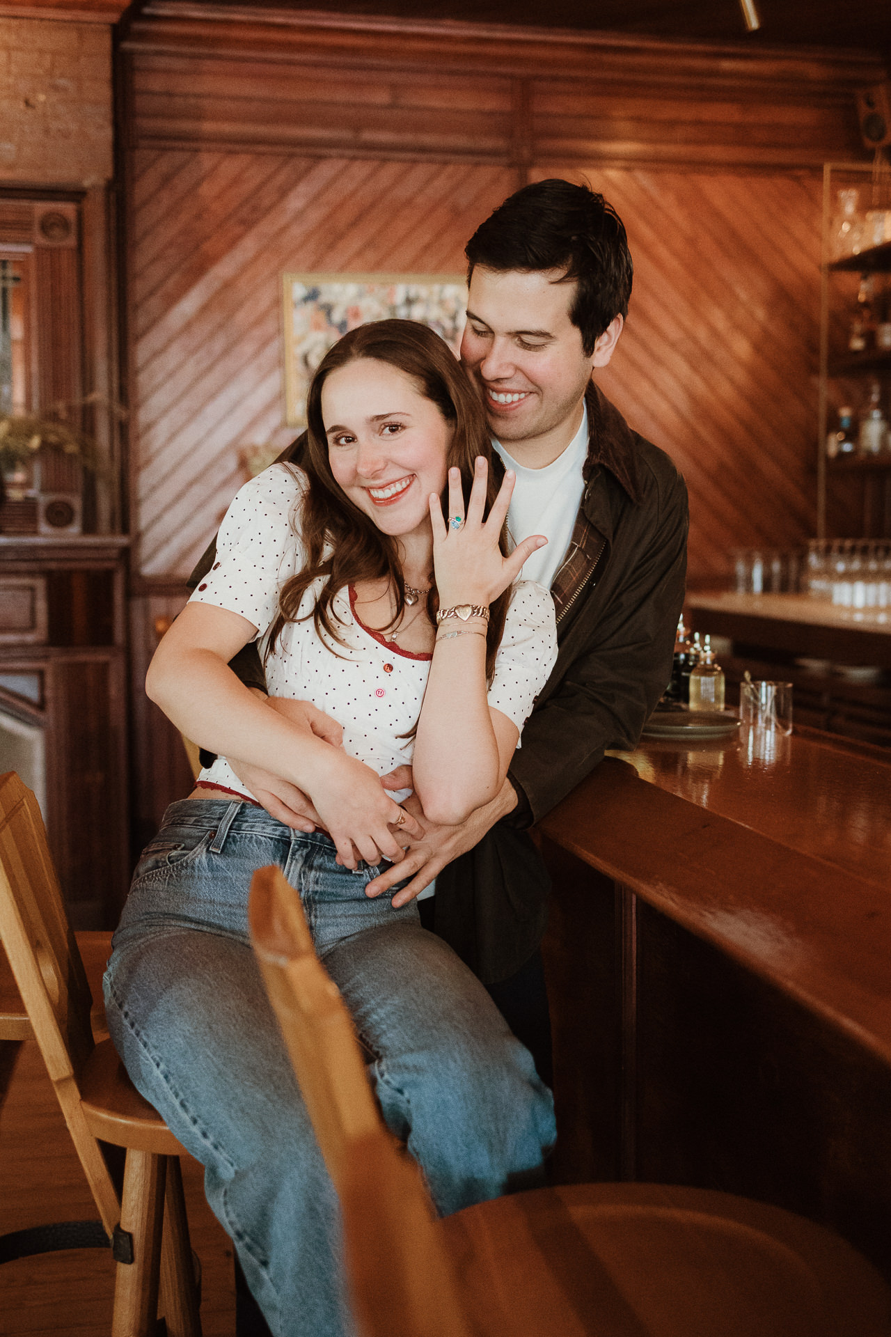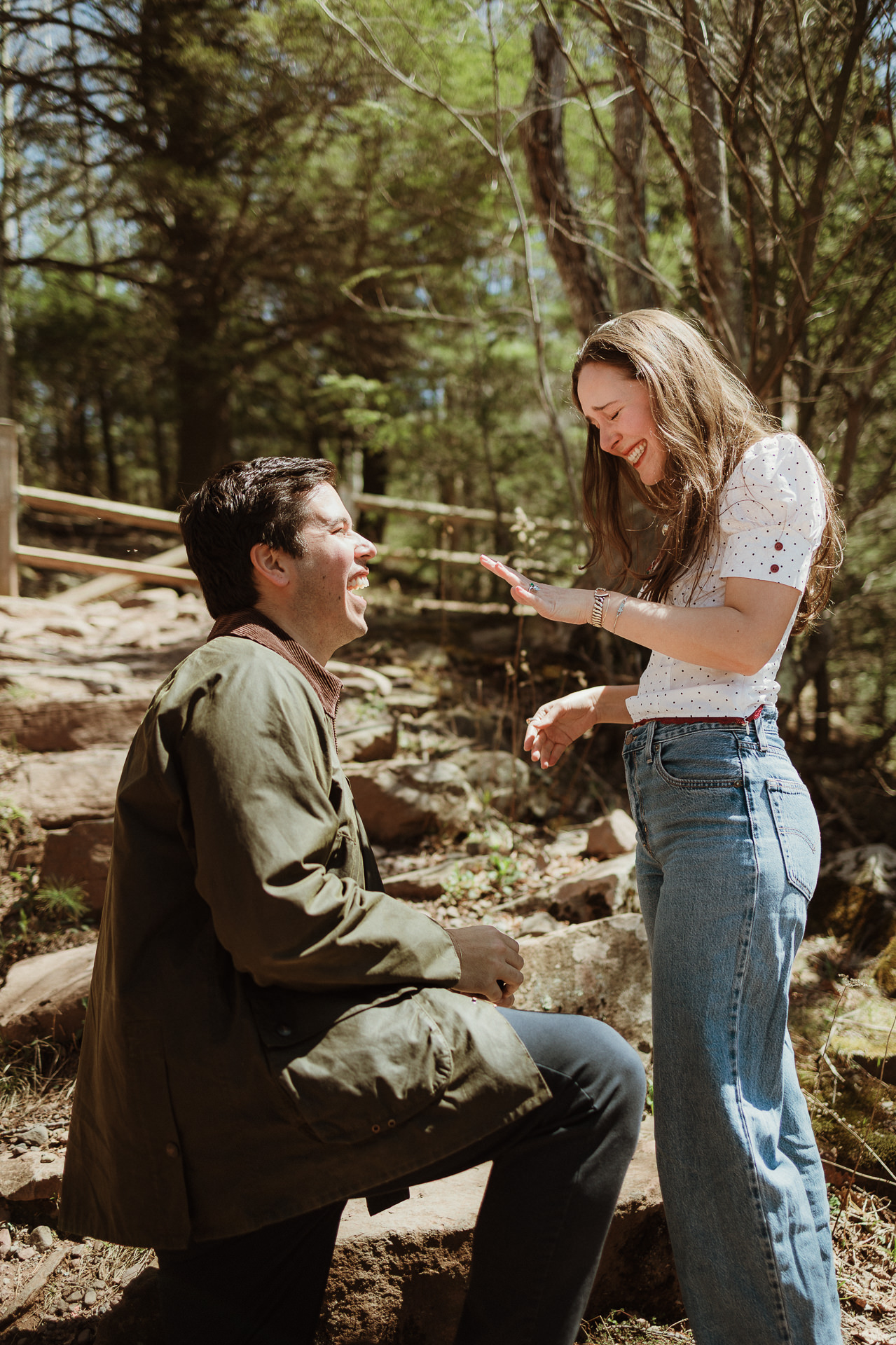 This Hotel Lilien proposal unfolded in a magical way! After a few months of emails with Dan, the day arrived! We were then messaging in real time regarding what we were both wearing and he sent at least 5 messages going between faded blue denim and navy pants (which we laughed about a lot, later!). The plan was to propose at the Kaaterskill Falls viewing platform, but nobody could have anticipated a sunny 74 degree day in April that brought out the crowds. So after seeing each other there, we walked about a minute further to a random quiet spot and the magic unfolded! Marissa was SO happy she forgot to initially say yes, but based on all the clues, it was a very very loud yes, even without the actual word at first! After a walk through the trees we headed back to Hotel Lilien for some more photos. The hotel is iconic, if you haven't been, you should go. It has an amazing spirit, great food, wonderful hospitality and is a place you'll quickly wish you lived at! We took more photos inside and out and had the best time celebrating their new engagement with some really sweet moments! Take a peek!